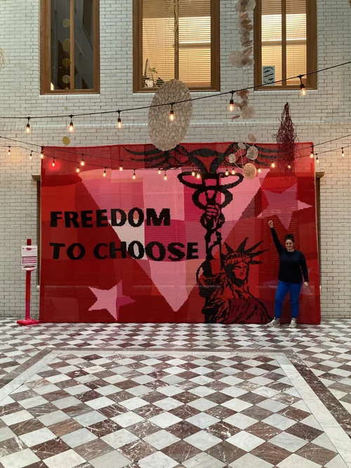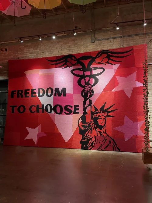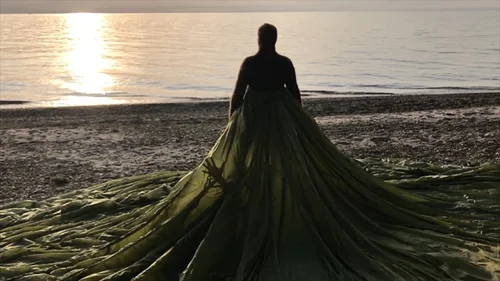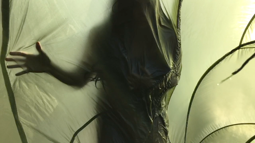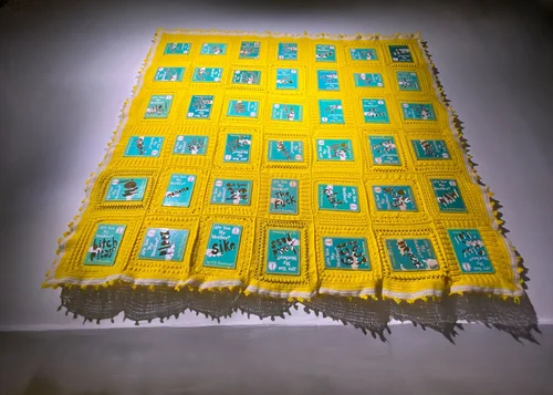 MATERIALS USED: Unusable CDs and DVDs, human hair, old curtains and demin jeans dress, guitar strings, spiral notebook springs. The CDs were collected from SCRAP and from an elementary school’s computer lab.